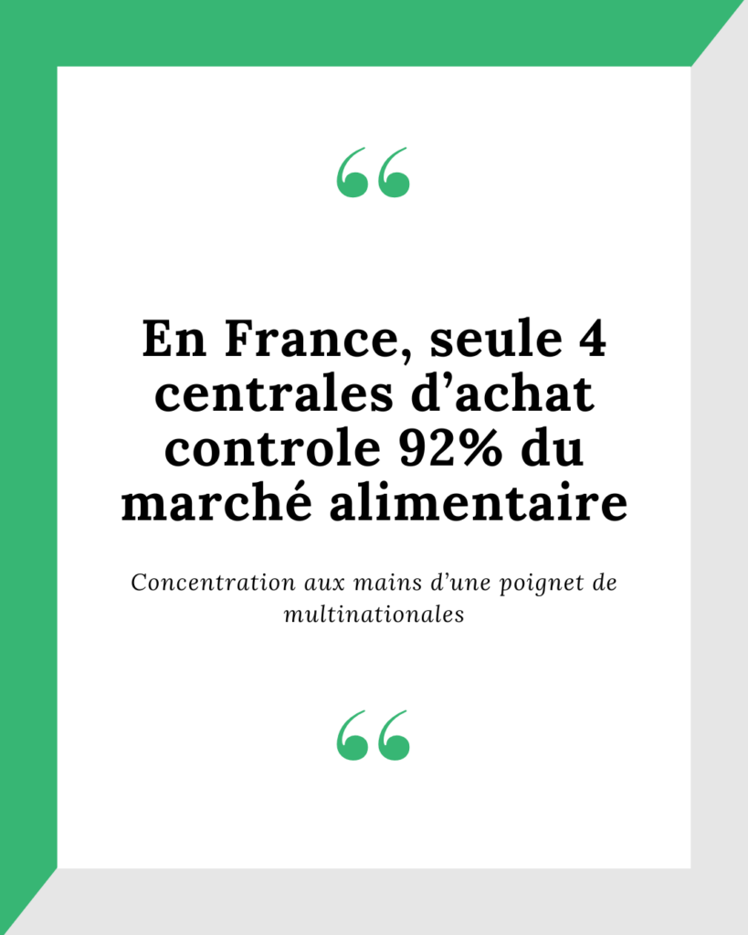 En France, nous comptons seulement 4 centrales d’achat contrôlées par 92% du marché alimentaire: Leclerc, Horizon pour Auchan et Casino, Envergure pour Carrefour, Cora, Système U et Intermarché.